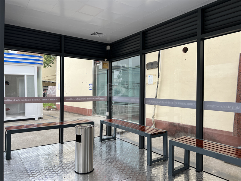 鋼化玻璃吸煙亭:光線明亮,安裝方便,工廠組裝好成品整體運輸吊裝到位,堅固耐用,使用壽命至少十年,重型鋼結構,抗臺風。頂部使用鋁板防水隔熱材料,保證下雨不漏水,隔音效果優良。并且內置電路,只要通電就可以在亭內使用電力設施,室內配置休息椅和煙灰桶,方便的功能,時尚的外觀,實在是廣大禁煙場所的不二之選!
